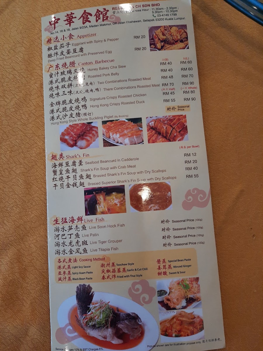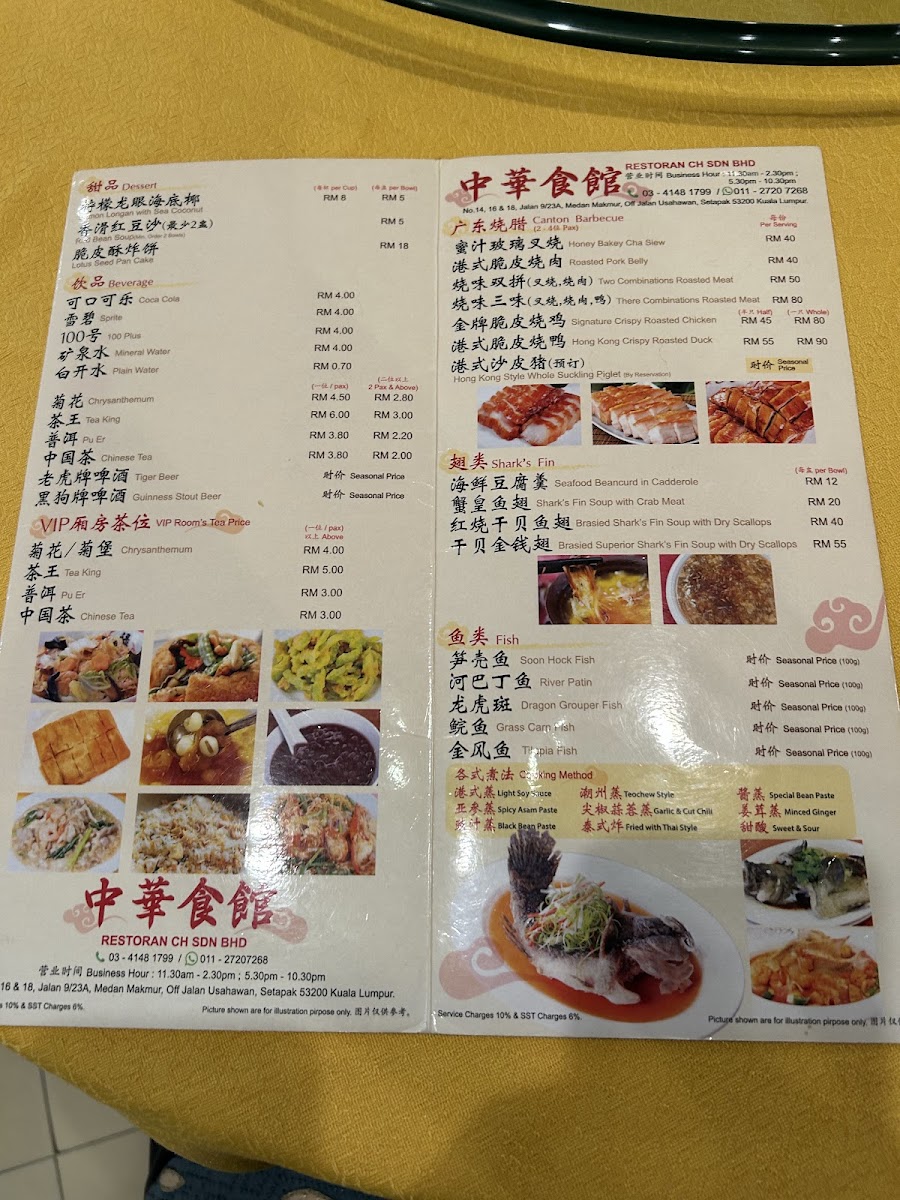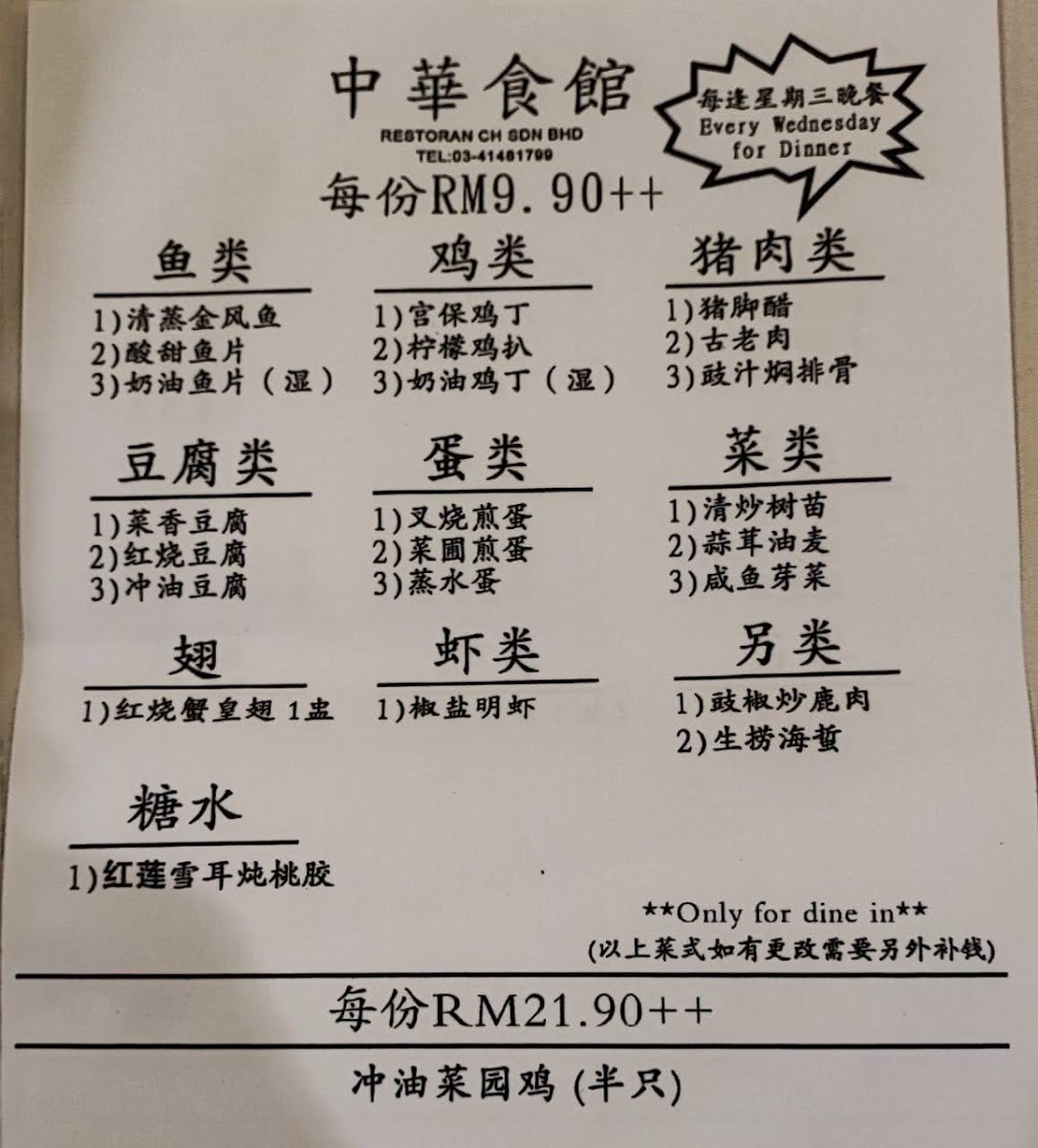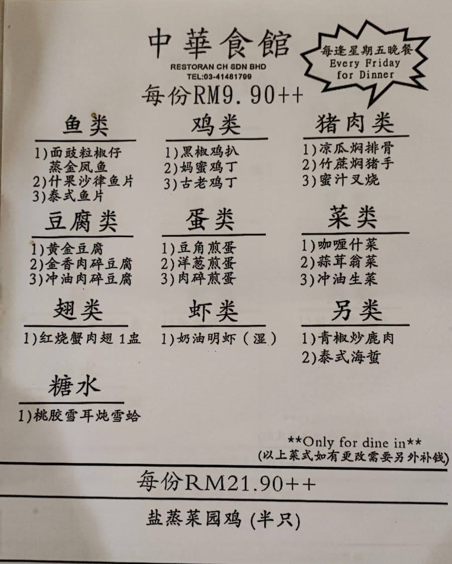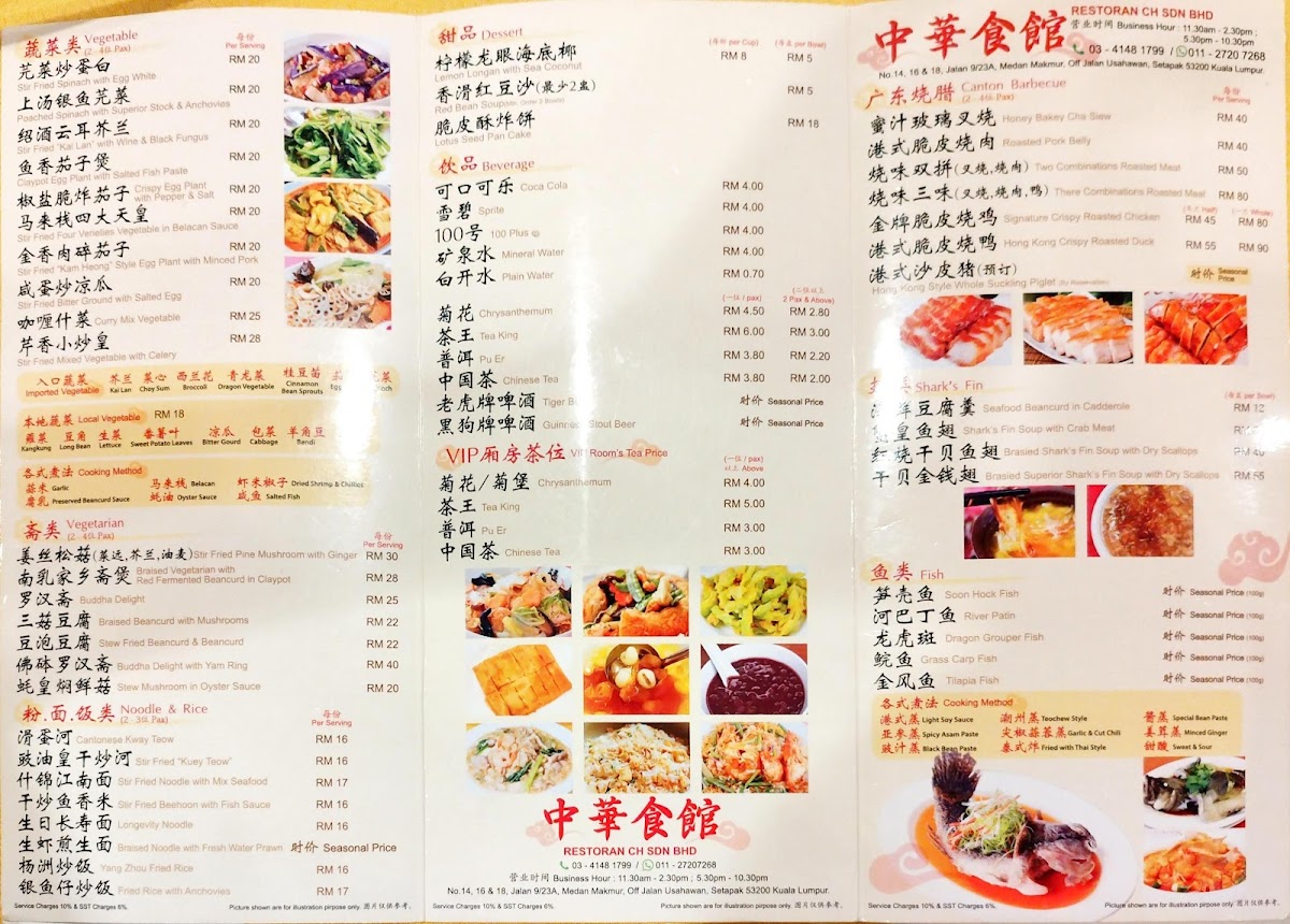 Restoran CH Sdn. Bhd.中華食館有限公司 Menu